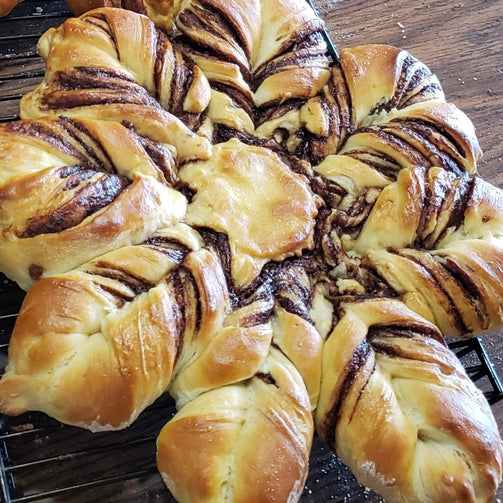 A super soft and sweet breakfast loaf that makes a perfect tear-and- share. Its also great kept in the fridge. Just pull off a point, microwave for around 10 seconds so it gets nice and gooey, and enjoy. This is best served heated slightly. Choose Nutella, Cinnamon, or Ginger.
